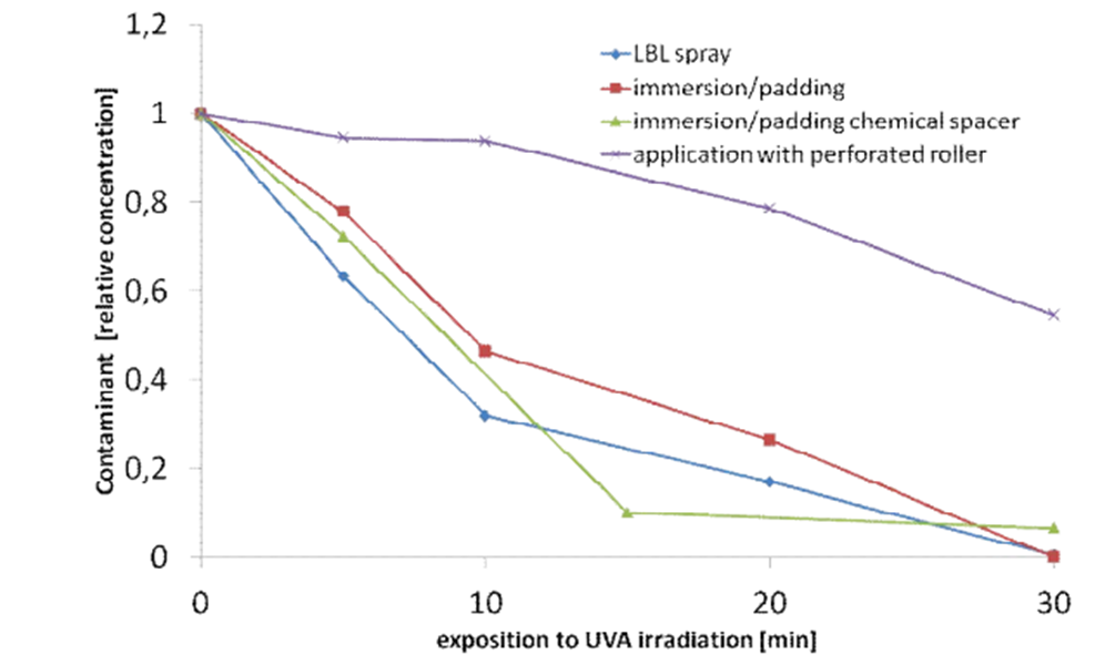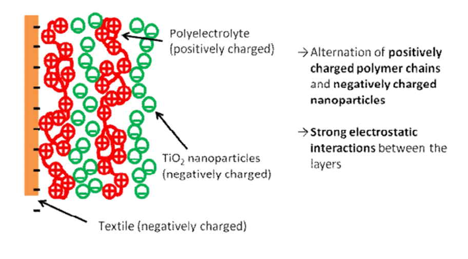Le textile reçoit en fait un dépôt de TiO2 en plusieurs couches (une couche de dioxyde de Titane, une couche de polyélectrolite, etc), tenant par interactions électrostatiques fortes.