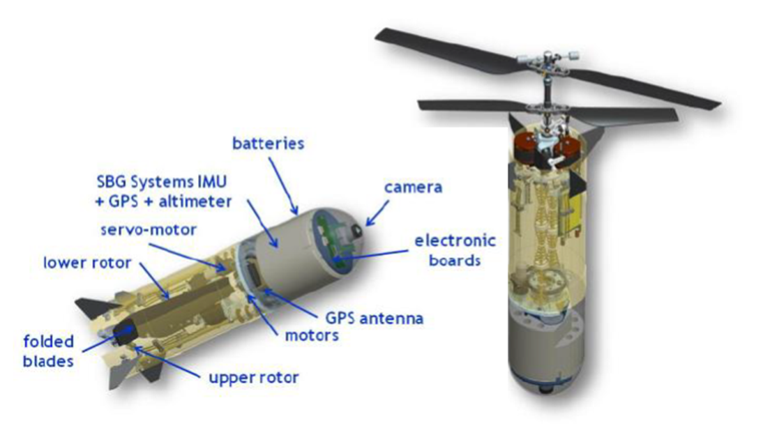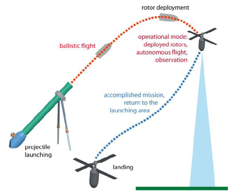 Le concept est original puisqu’il consiste à lancer, à partir d’un tube portable (10 kg) dédié, un projectile subsonique qui se transforme en drone miniature (MAV) à rotors coaxiaux contrarotatifs une fois arrivé au-dessus de la zone d’opérations. Le schéma ci-dessous illustre le principe du GLMAV :