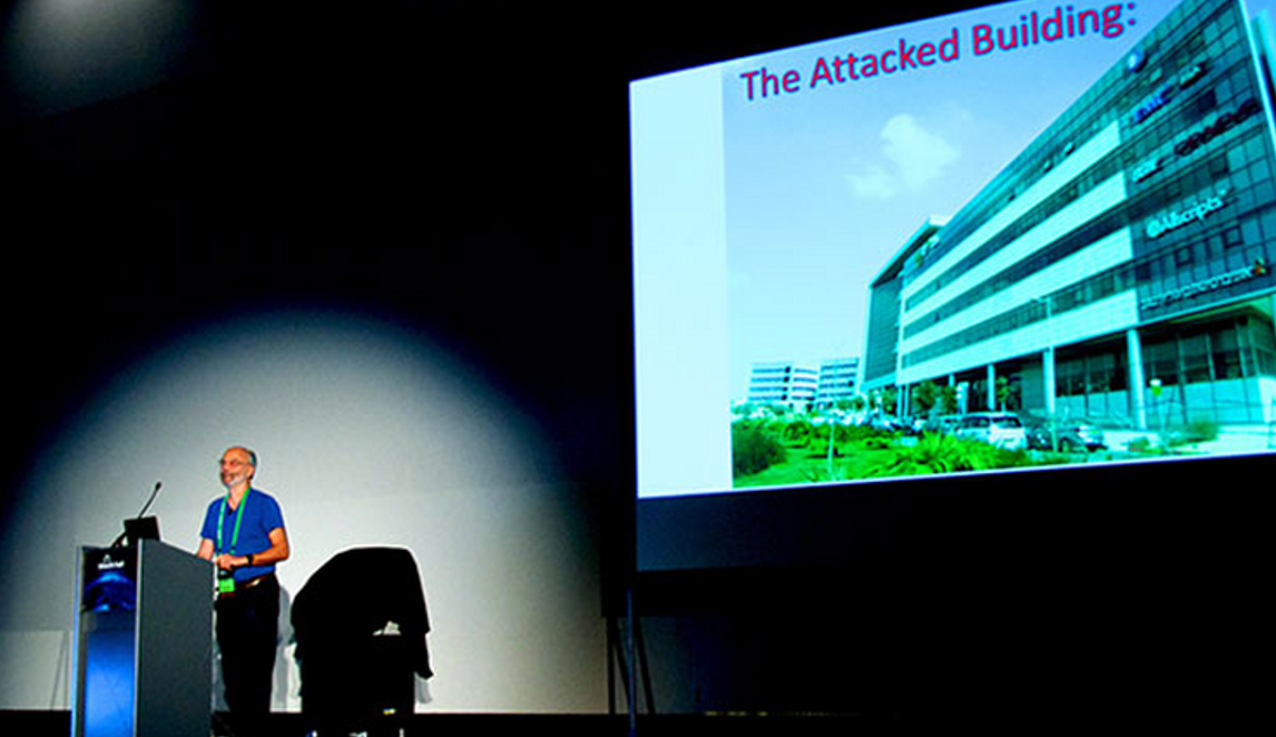 Malheureusement, difficile pour l’instant de trouver davantage d’informations sur le principe. Mais toute médaille a son revers : le développement d’une telle technologie montre les limites de ce que l’on appelle la sécurité par « air gap » consistant à isoler physiquement par un espace vide deux réseaux que l’on cherche à protéger. On savait déjà que via des périphériques, notamment graphiques ou audio, il était possible de récupérer des informations sensibles – Le groupe Black Hat Europe avait ainsi montré, il y a quelques mois, qu’un laser infrarouge pointé sur un scanner d’un réseau isolé suffisait à s’introduire dans le réseau. La photo ci-dessous montre le chercheur israélien Adi Shamir au keynote de Black Hat Europe.